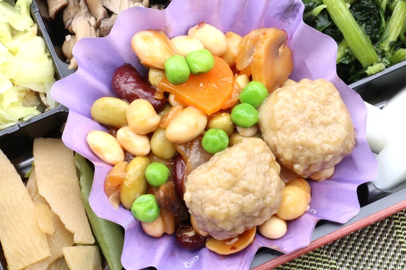 日替わり:特製😍鶏のごぼう揚げ 健美膳(要前日予約):チリビーンズ🥜