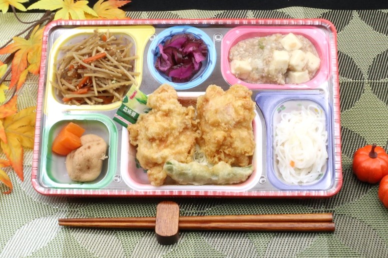 日替わり:鶏天🍵抹茶塩付き 健美膳(要前日予約):豆腐ハンバーグ🏕️
