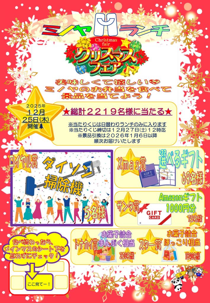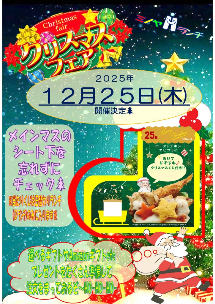 12/25(木)はクリスマスフェアとしてイベントを実施します🎉Dランチをご注文の皆さん、食べ終わったらぜひメインマスのシート下をチェックしてください✨素敵な当たりくじが入っているかも!?